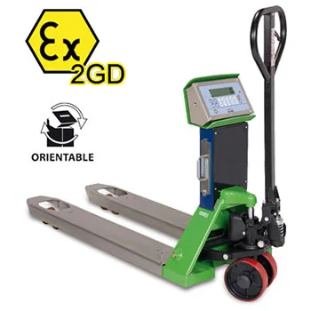 Wózki paletowe z zintegrowanym systemem wagowym, przeznaczone do użytku w strefach zagrożonych wybuchem (STREFY 1 i 21 oraz 2 i 22), zgodnie z certyfikatem Ex II 2G IIB T4 Gb X oraz Ex II 2D IIIC T197 °C Db X. Czujnik wagowy IP68 z certyfikatem Atex gwarantuje najwyższą precyzję pomiaru w każdych warunkach pracy. Wersje dostępne również z zatwierdzeniem CE-M.